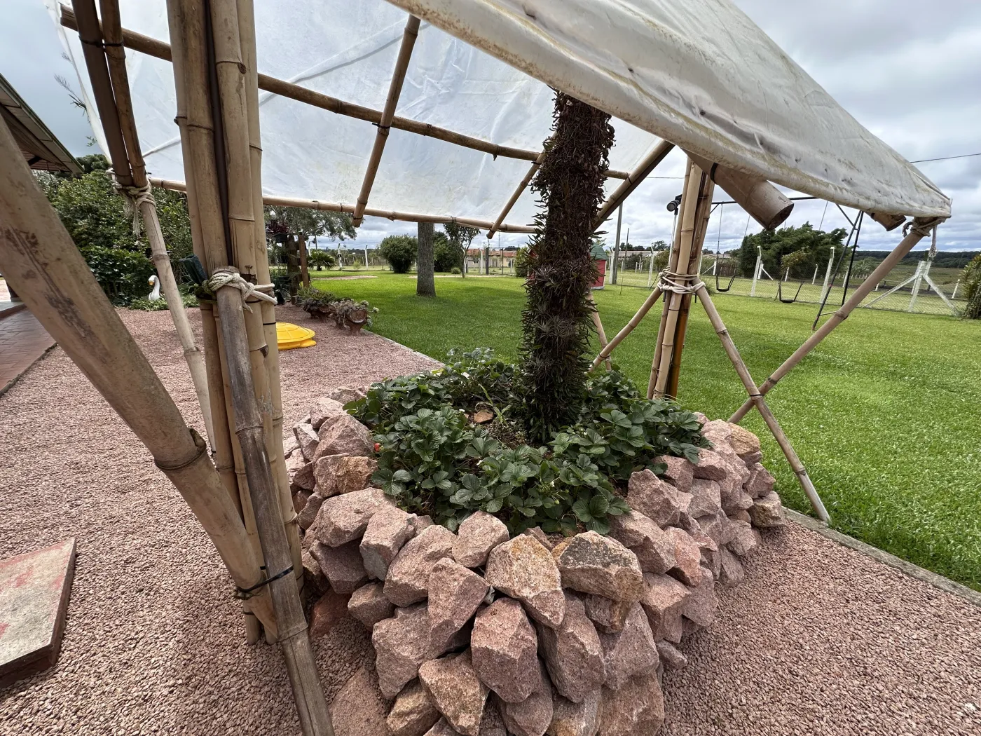 A área externa é um verdadeiro refúgio natural: pomar completo, plantação de bambu, sistema de reutilização de água, reforçando o compromisso com a sustentabilidade, e um lago encantador com várias espécies de peixes e aproximadamente 10.000 metros quadrados, que transforma a paisagem em um cenário único e inspirador.