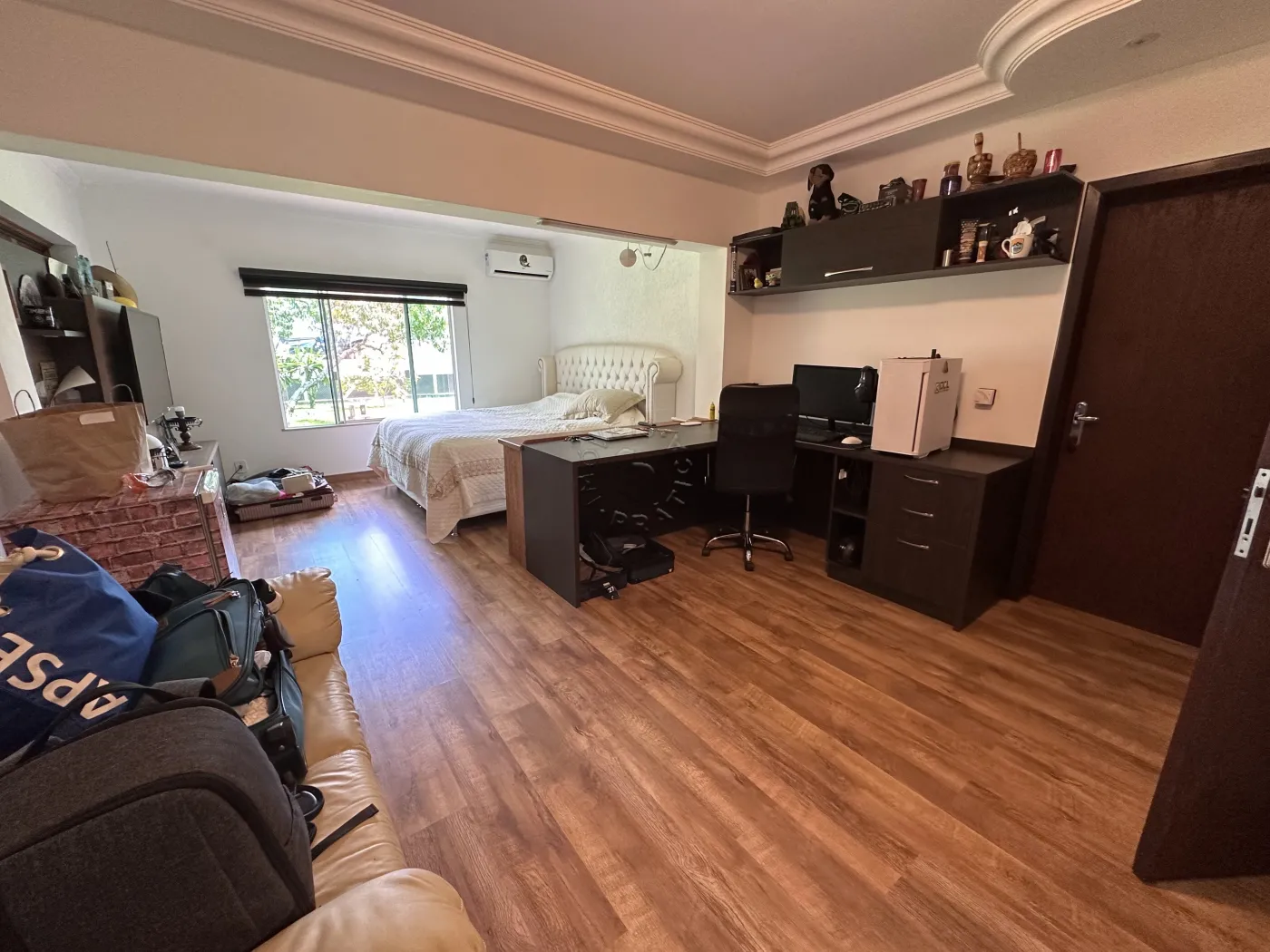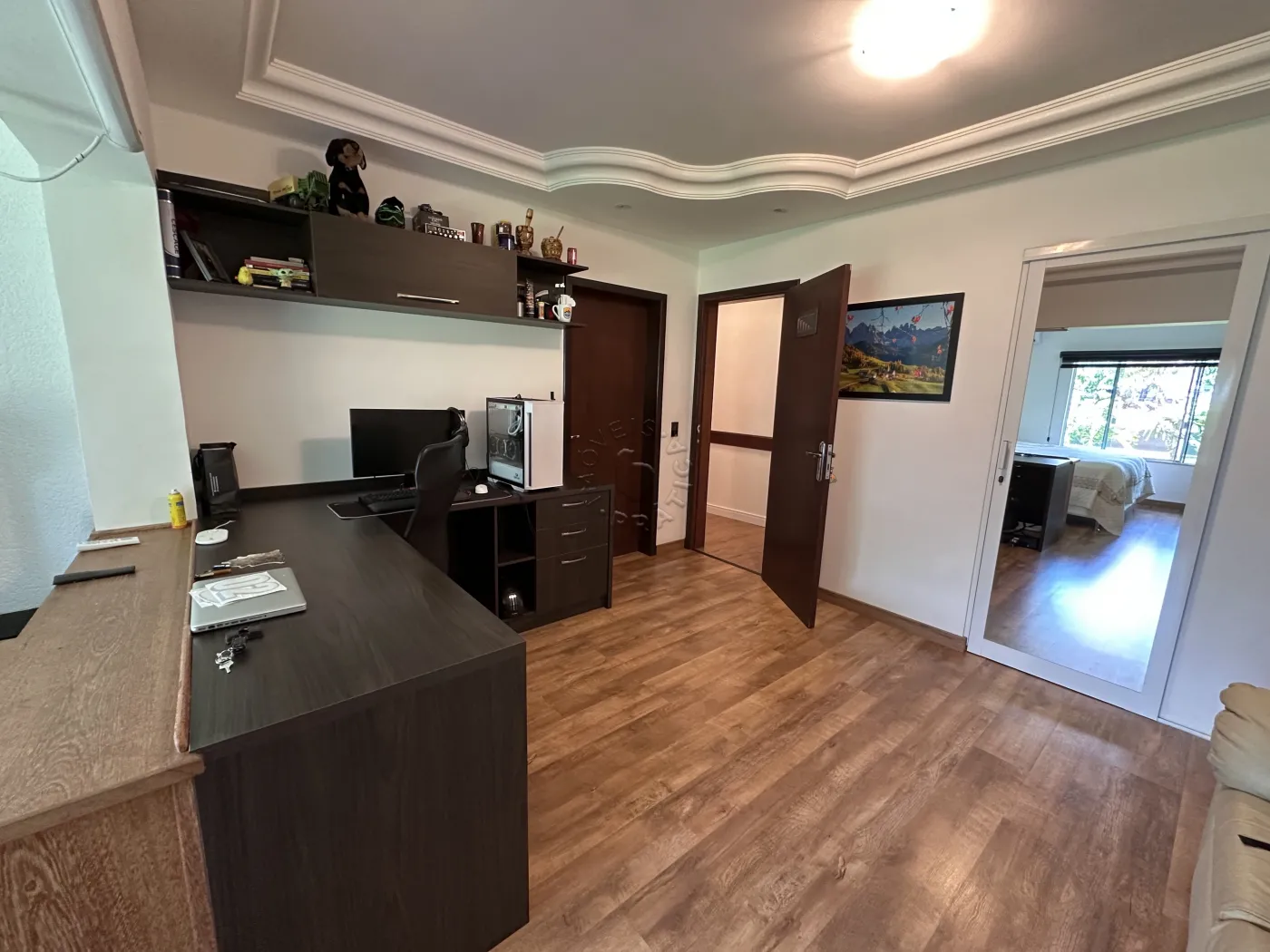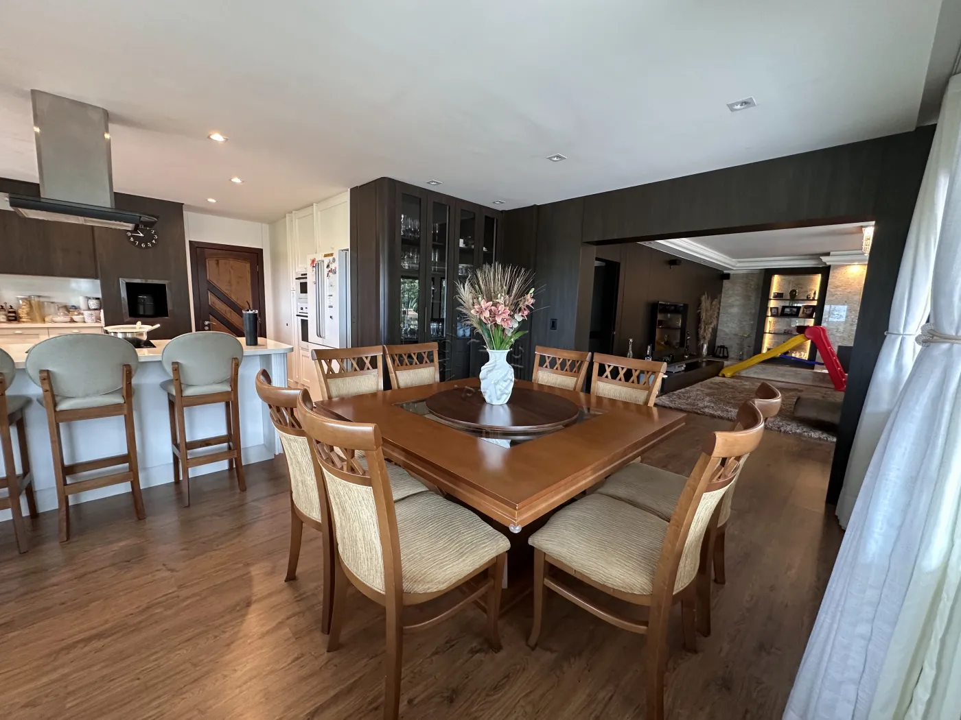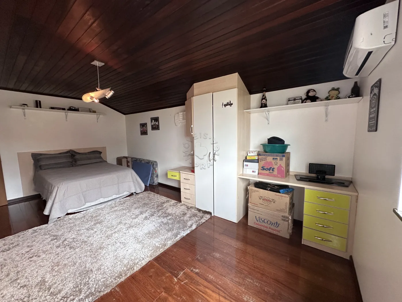 No piso superior, a residência oferece três quartos, uma sala de TV, um mezanino amplo e imponente, duas sacadas e ambientes climatizados com ar-condicionado. O acabamento é um espetáculo à parte, com forro em madeira itaúba e vigas em ipê champanhe, trazendo sofisticação e charme atemporal.