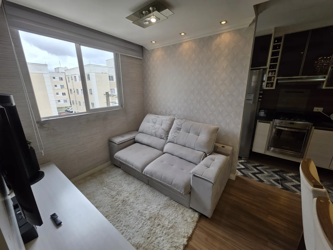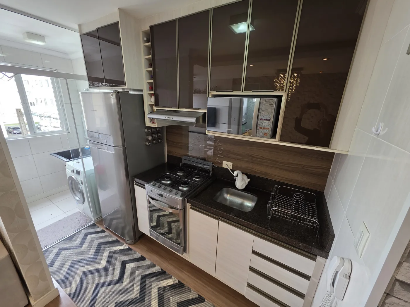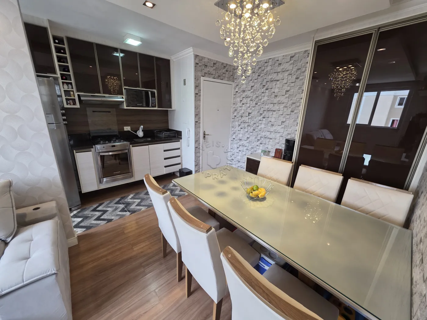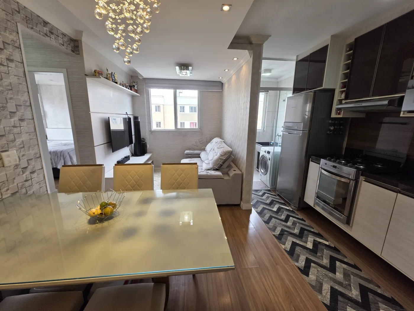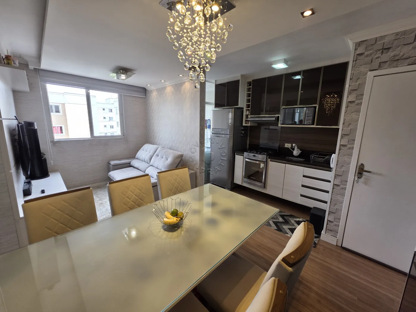 O imóvel conta com uma cozinha planejada completa, equipada com geladeira, fogão e micro-ondas, além de uma sala de estar integrada e bem distribuída, já mobiliada com sofá, rack para TV e jogo de mesa de jantar, criando um espaço perfeito para o dia a dia e momentos de convivência.