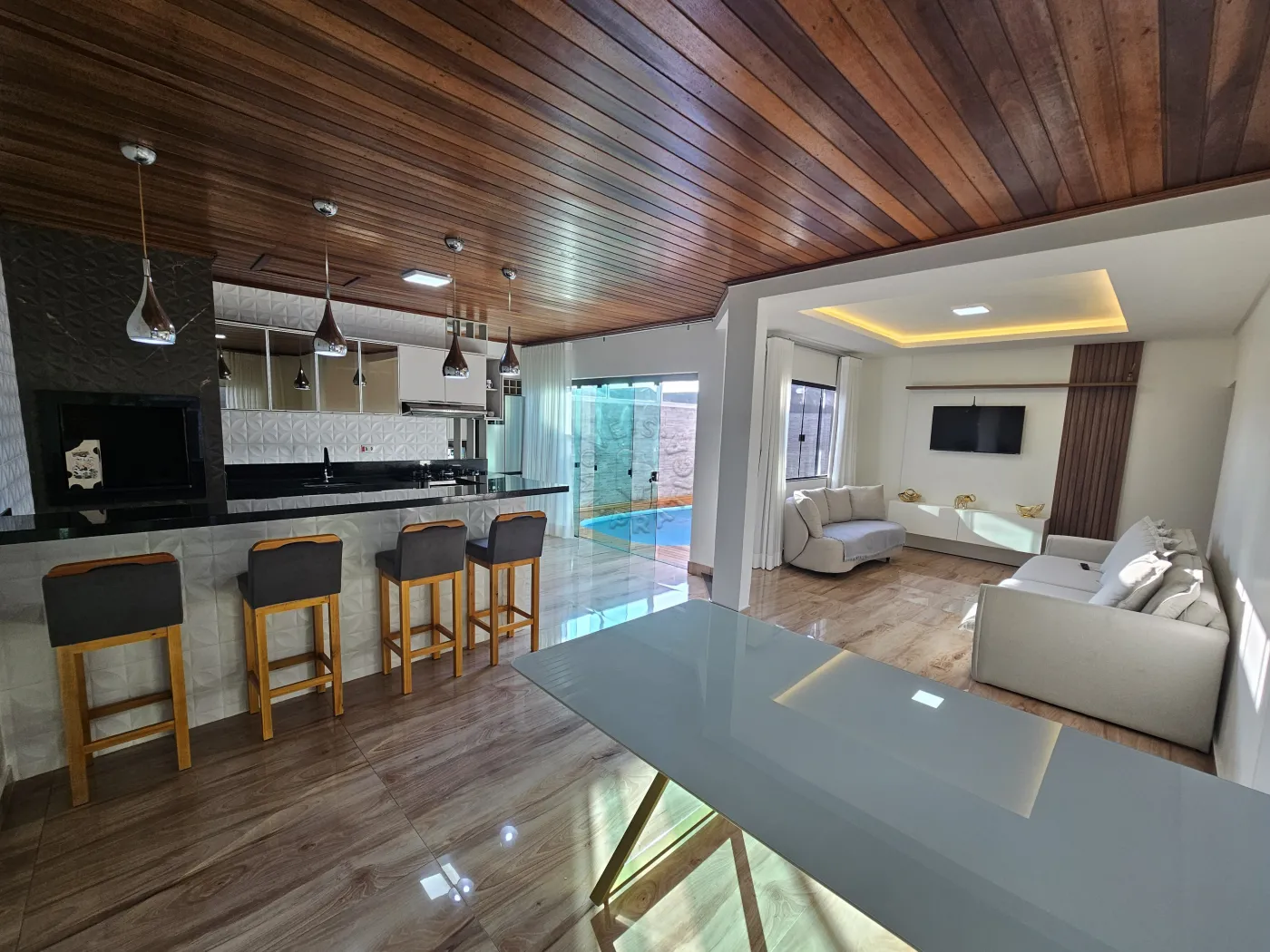 Para momentos de convivência e lazer, a casa dispõe de uma ampla sala de estar e uma sala de TV aconchegante, perfeitas para reunir a família e amigos. A cozinha é um verdadeiro destaque, planejada para quem ama cozinhar, possui uma churrasqueira integrada e oferece todo conforto e praticidade necessários.