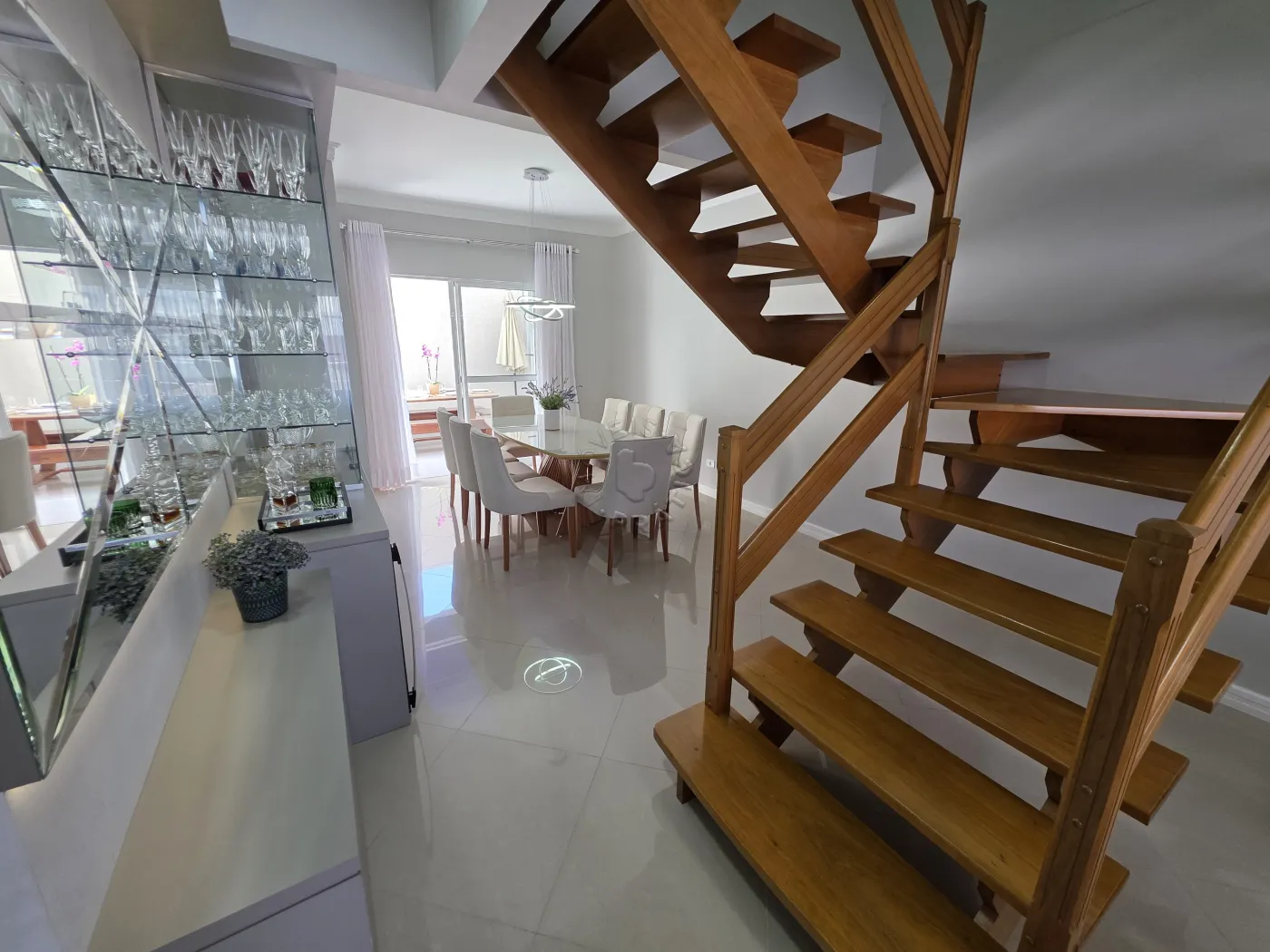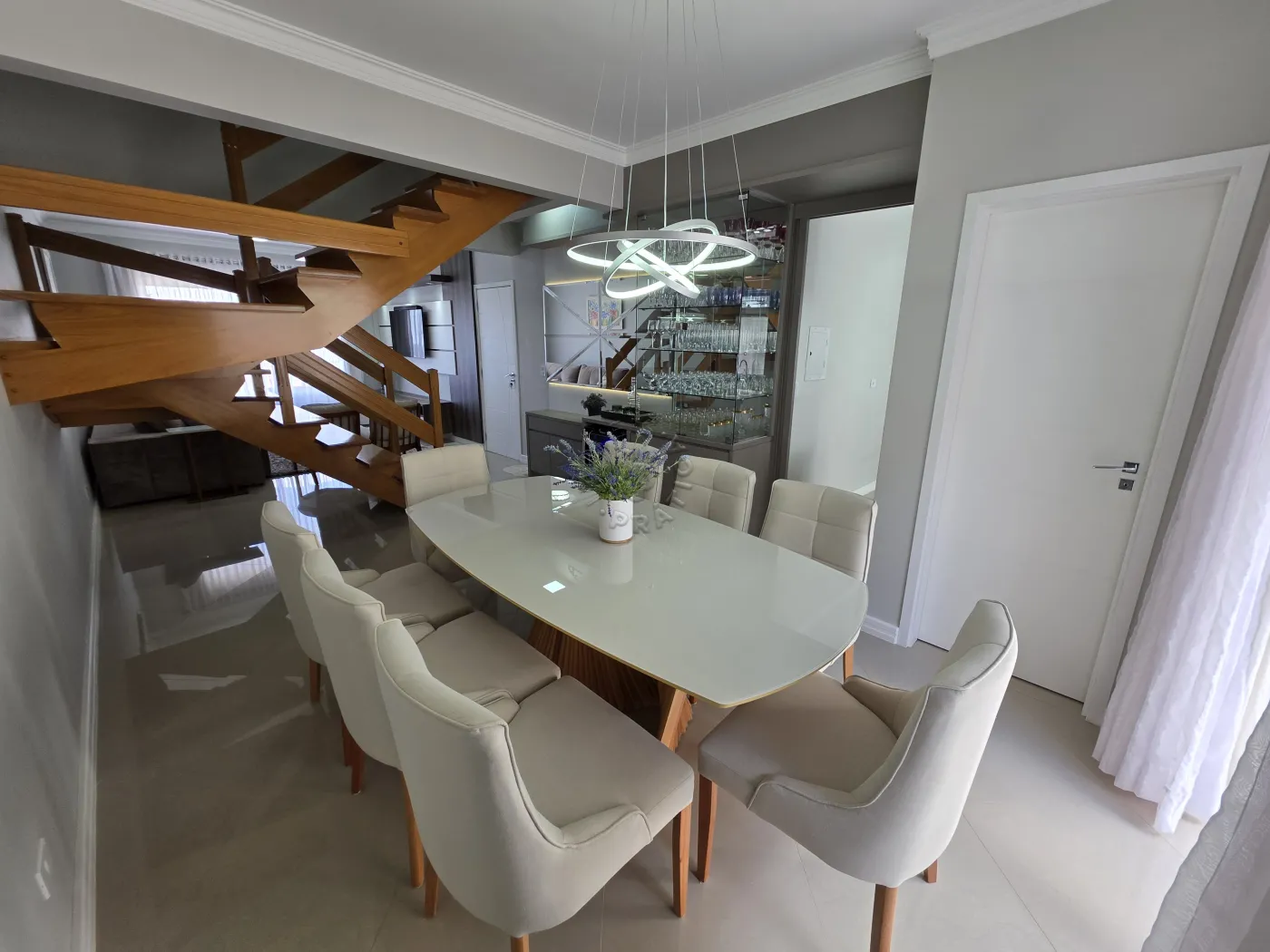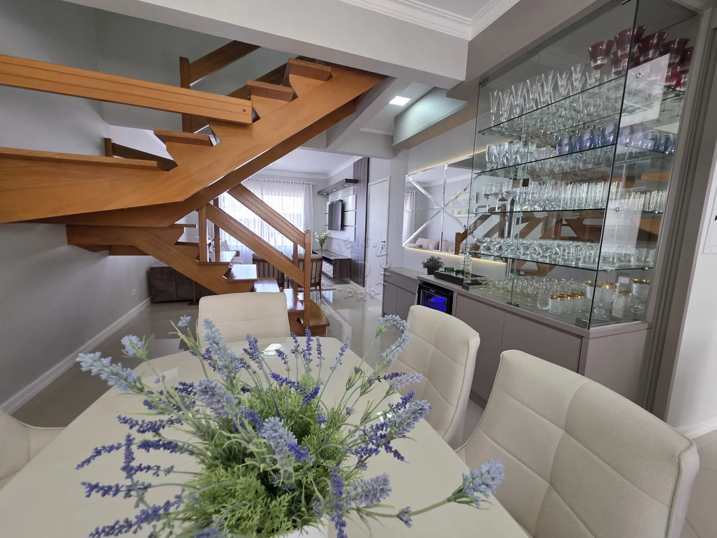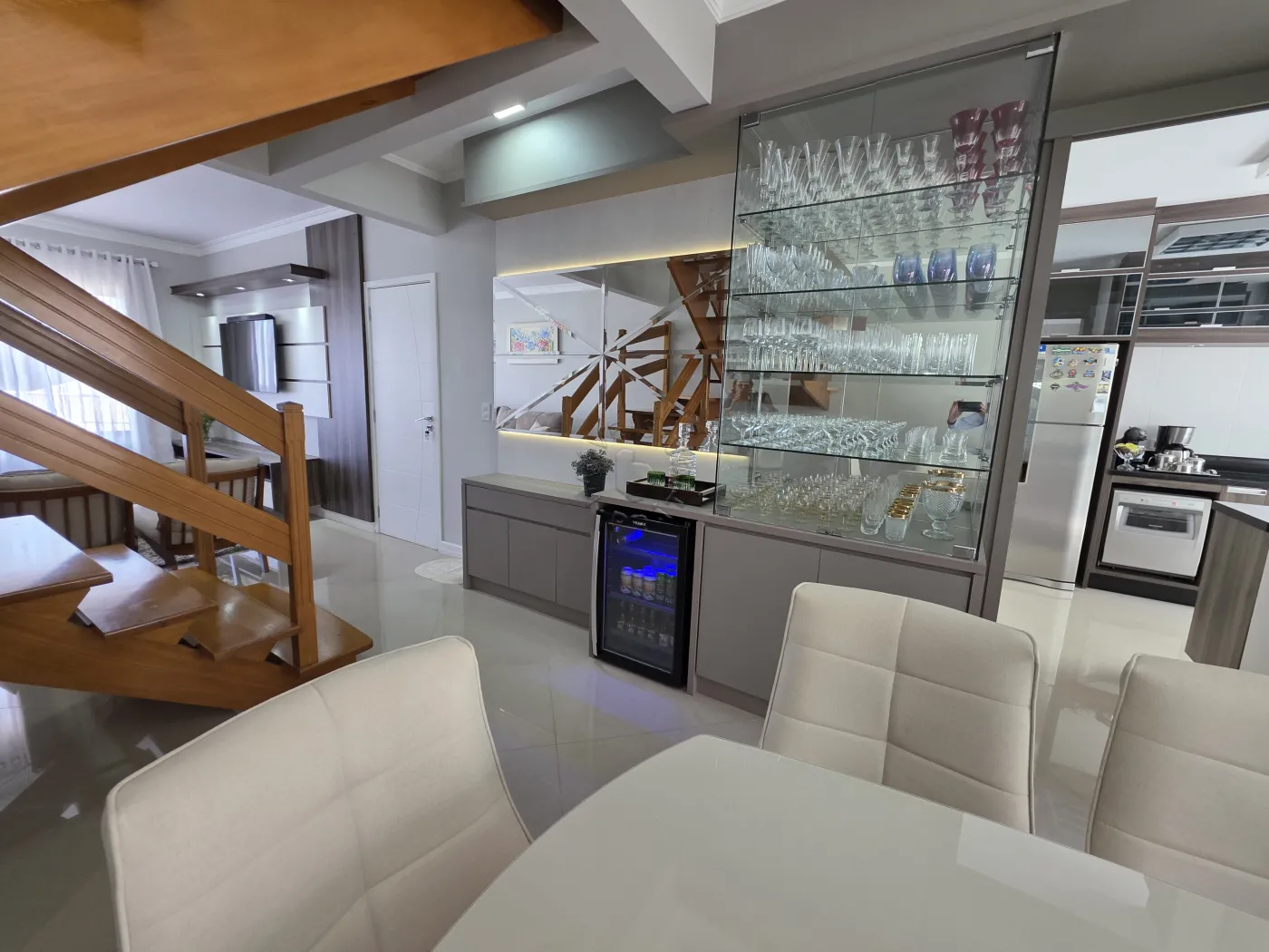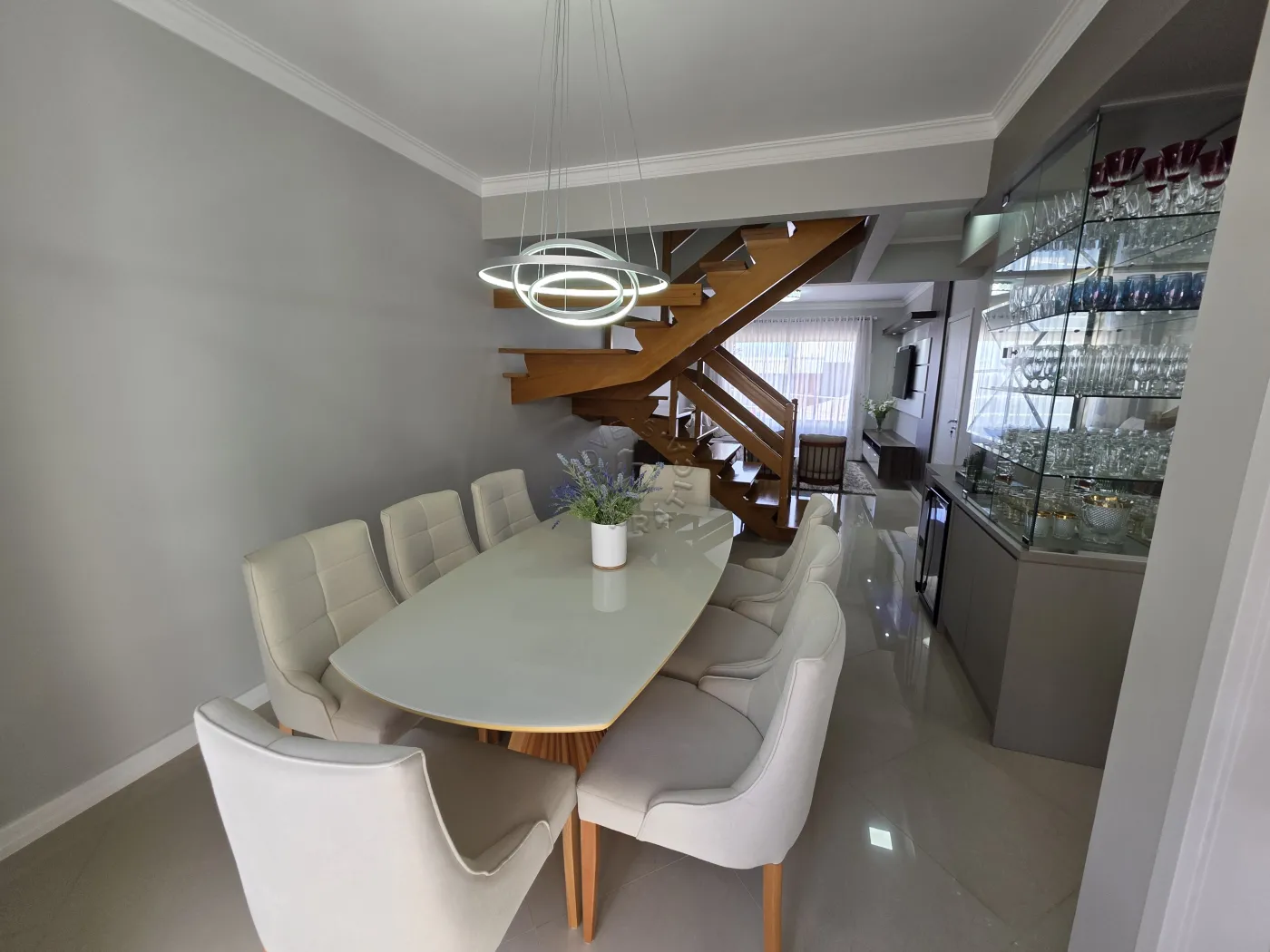 No piso térreo, o imóvel conta com uma agradável sala de estar integrada à sala de jantar, proporcionando um ambiente acolhedor para reunir família e amigos. Possui ainda lavabo, cozinha funcional, área de serviço, além de um espaço com churrasqueira, ideal para momentos de lazer. A garagem dupla completa a praticidade do pavimento.