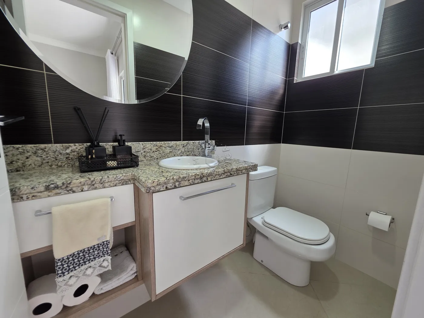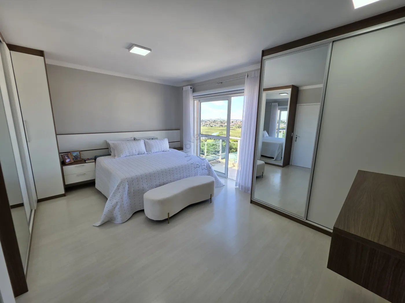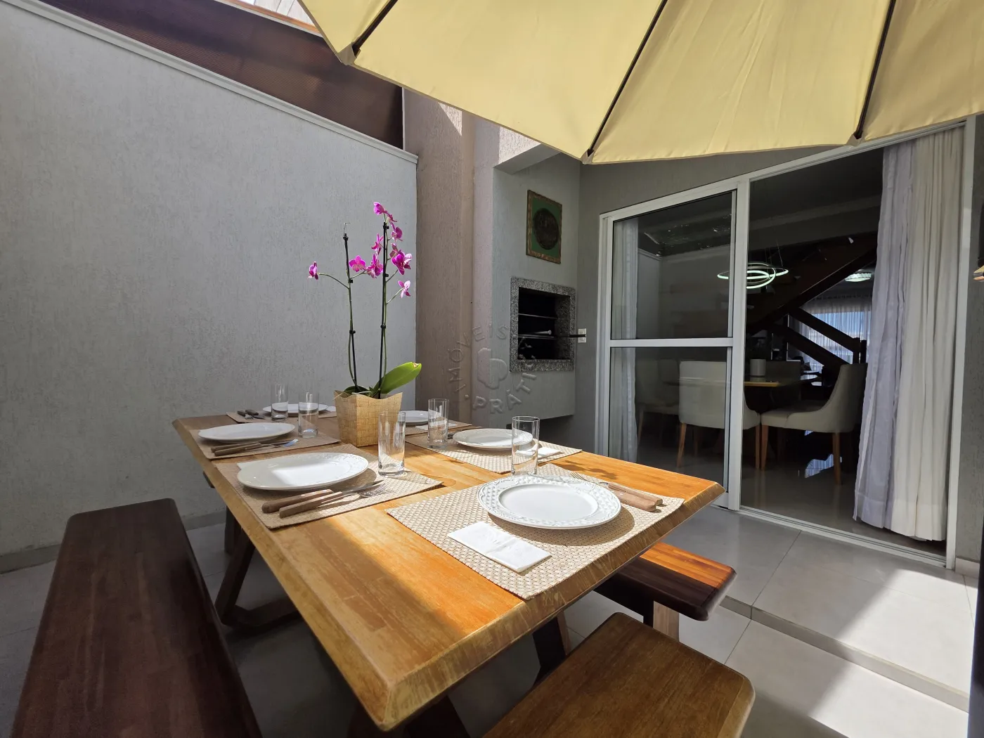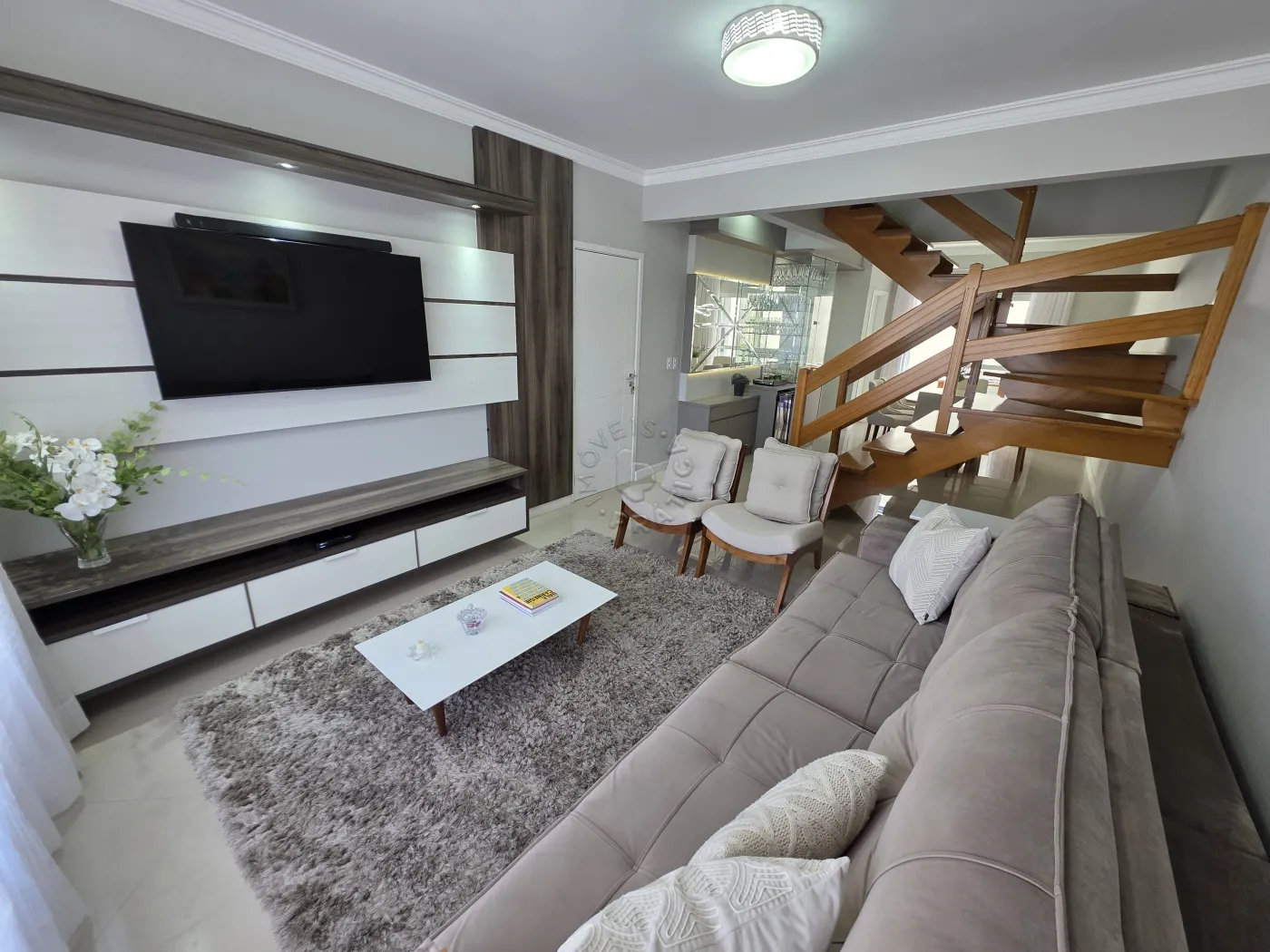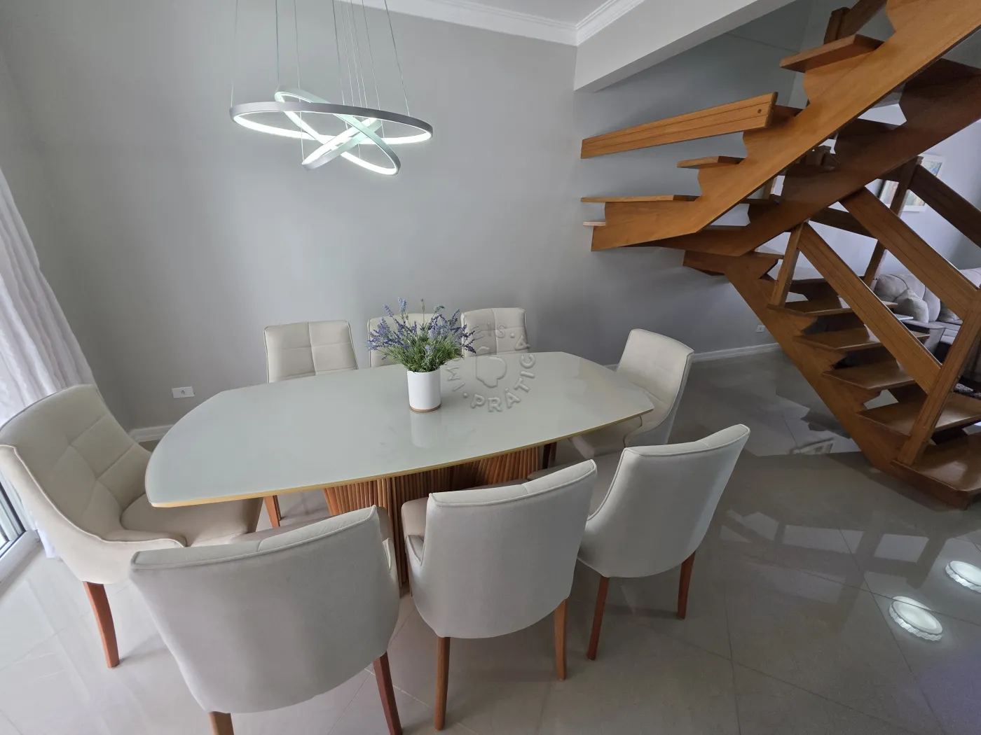 No piso térreo, o imóvel conta com uma agradável sala de estar integrada à sala de jantar, proporcionando um ambiente acolhedor para reunir família e amigos. Possui ainda lavabo, cozinha funcional, área de serviço, além de um espaço com churrasqueira, ideal para momentos de lazer. A garagem dupla completa a praticidade do pavimento.