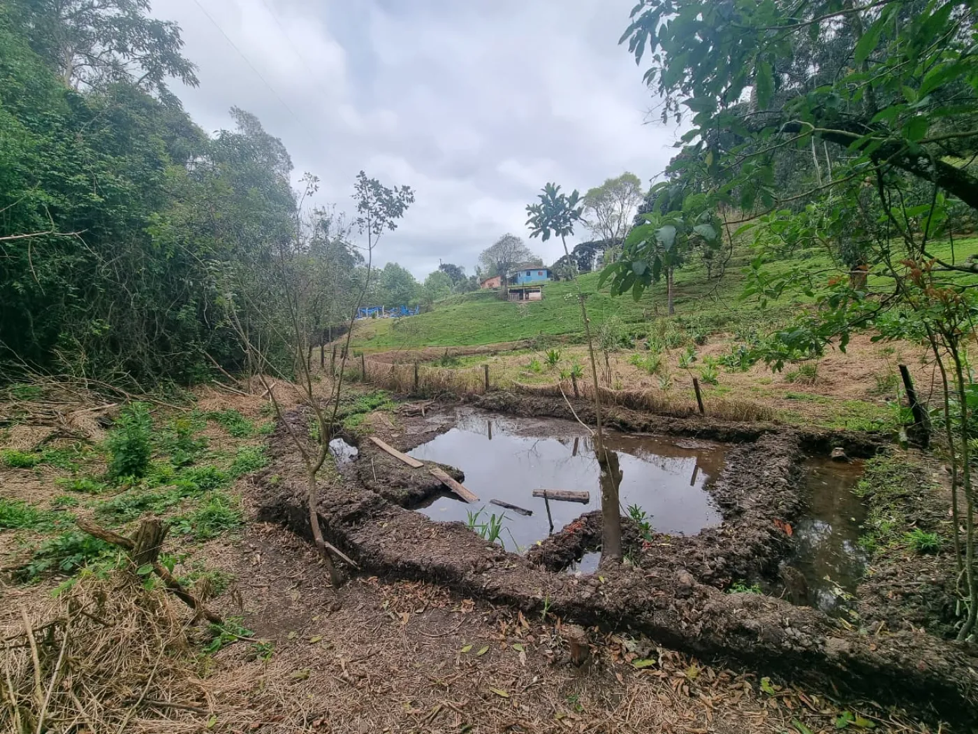 Tanque para criação de peixes em construção, ideal para lazer ou pequenos projetos de piscicultura;